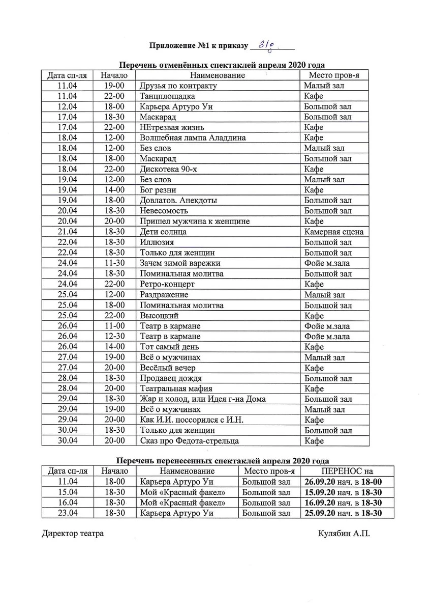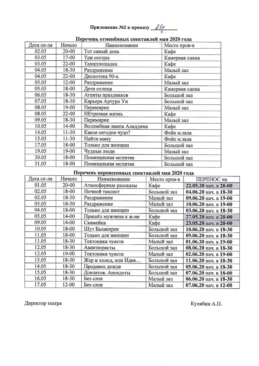 С перечнем отмененных и перенесенных спектаклей вы можете ознакомиться здесь