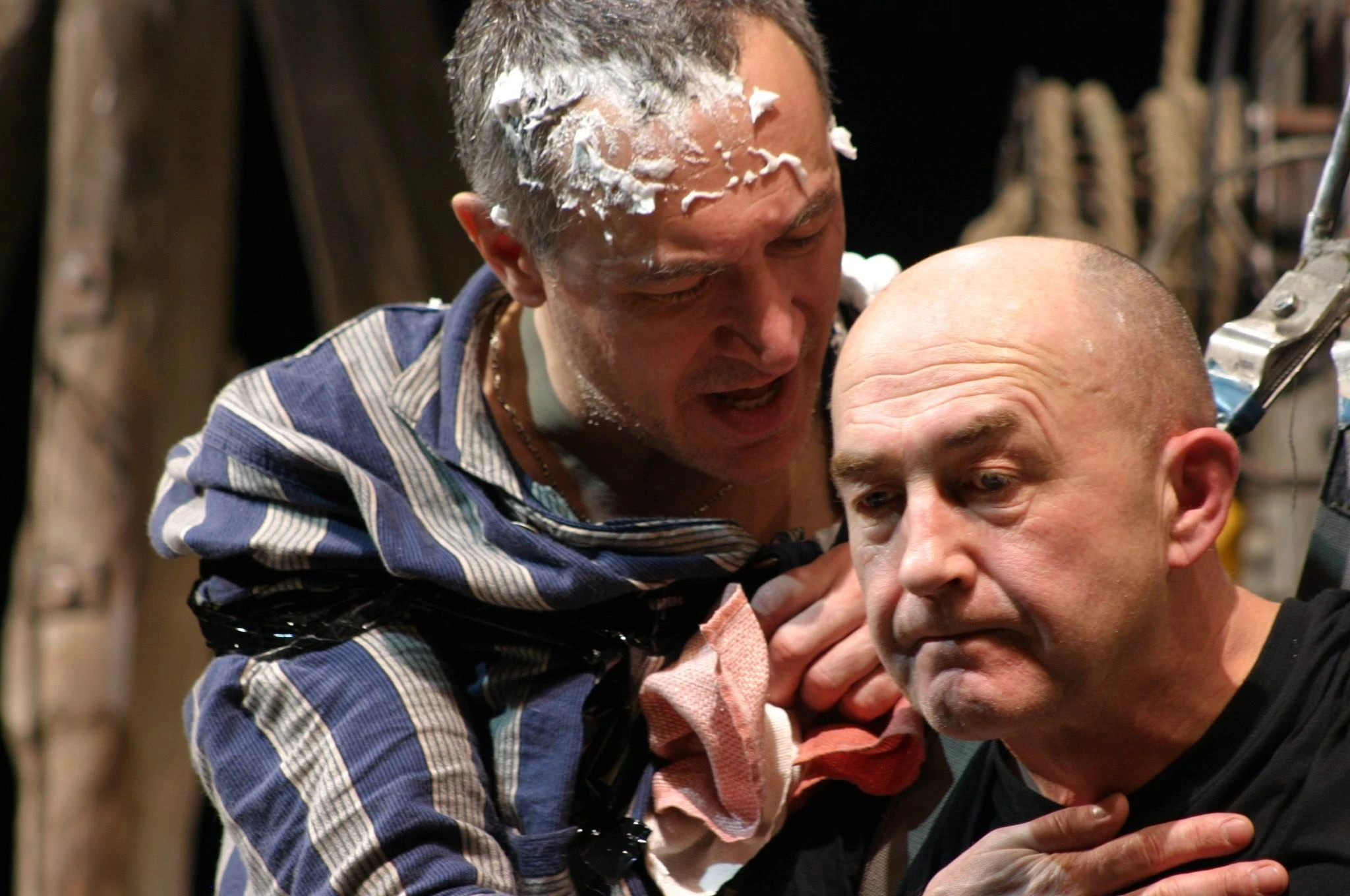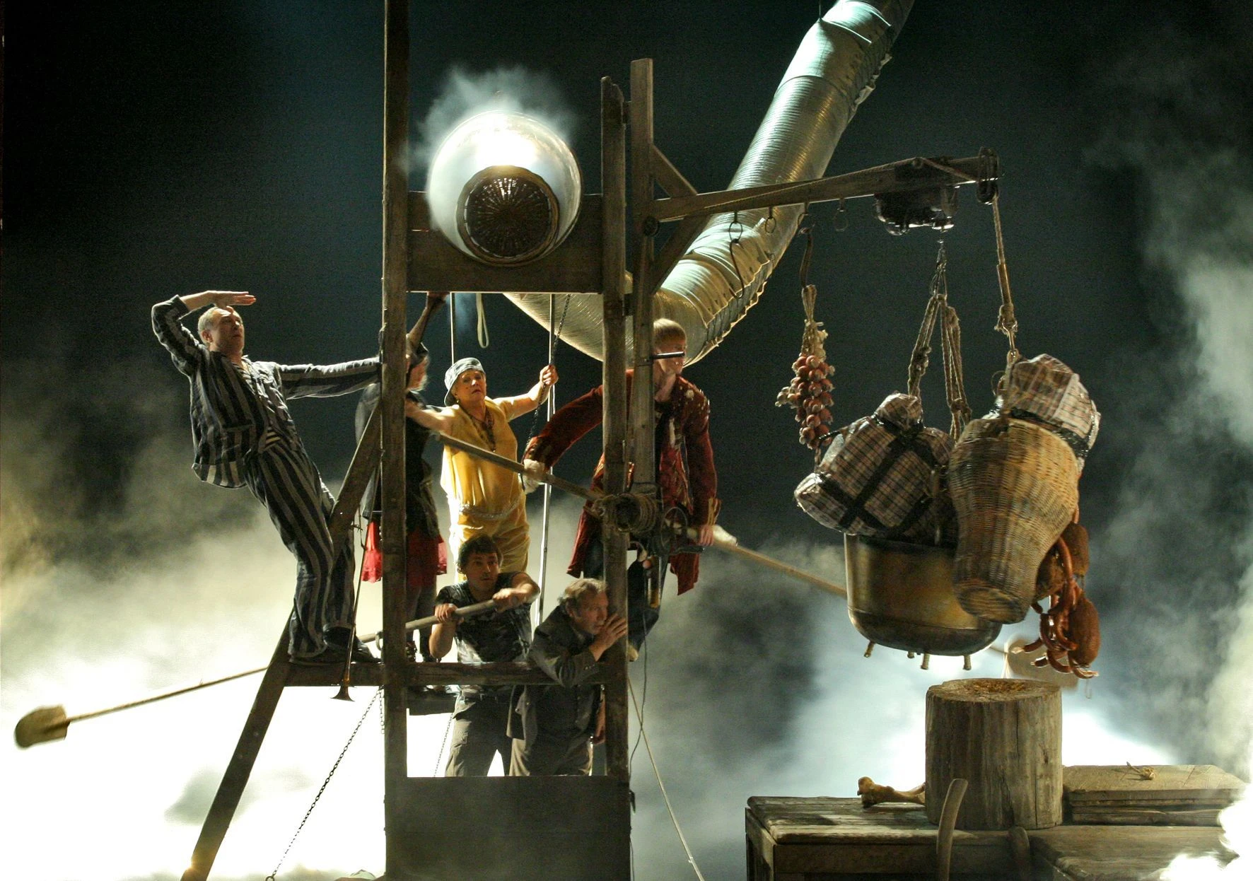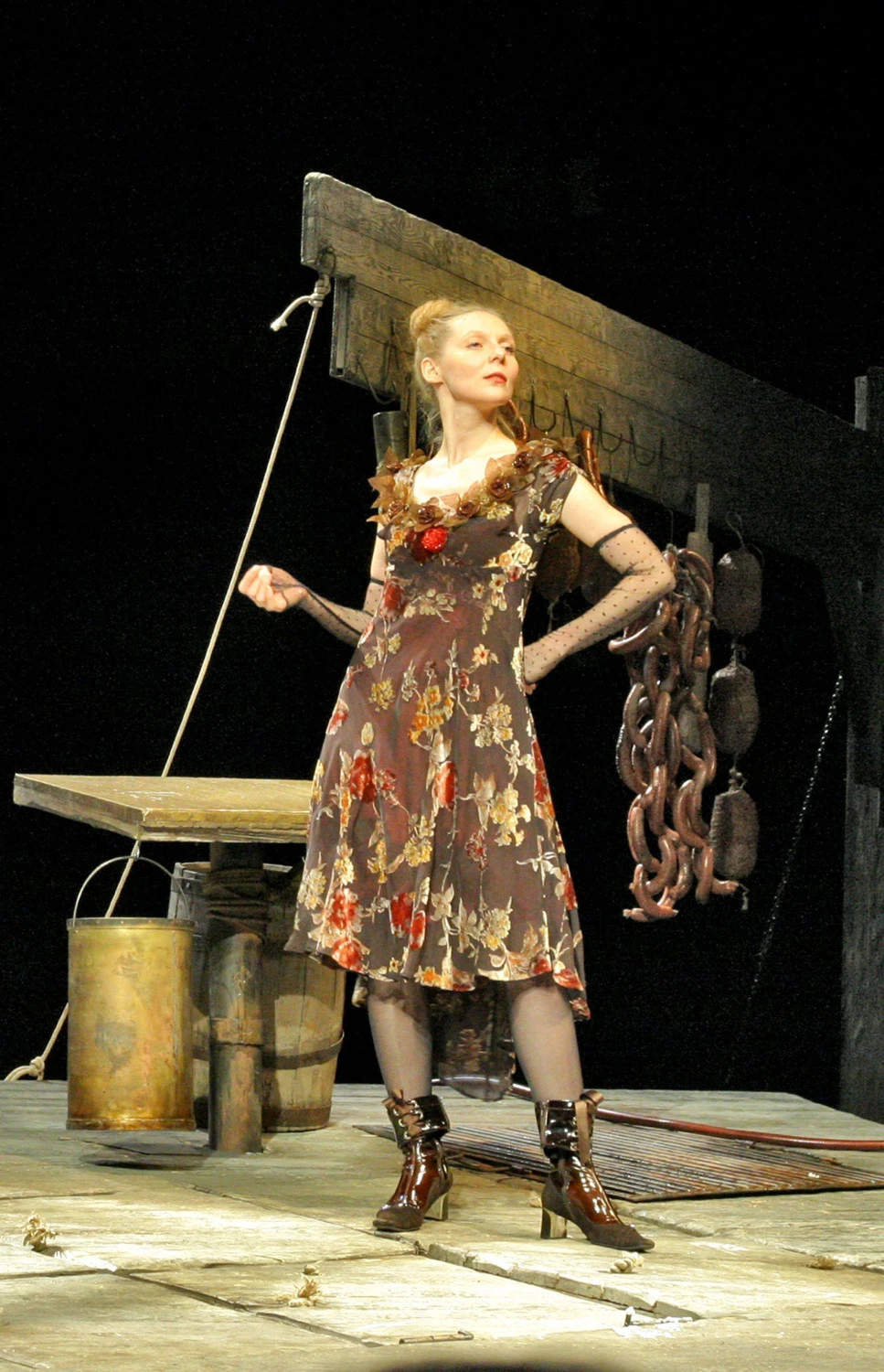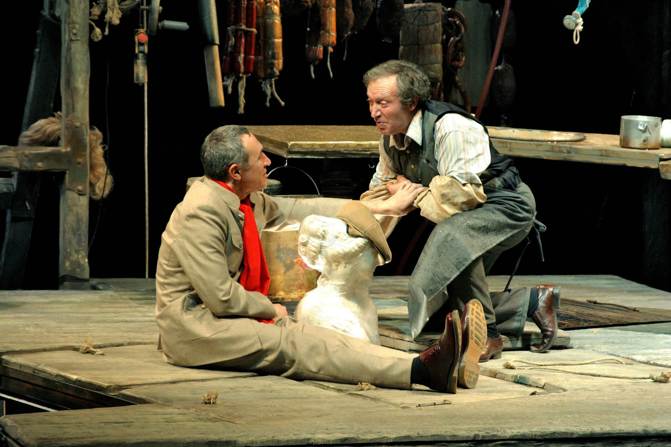 Мясные туши поступают сюда откуда-то сверху, перерабатываются у нас на глазах и полуфабрикатами «уплывают» дальше, на следующий этаж. То же самое происходит с душами персонажей пьесы. В символическом плане перед нами — картина Чистилища, где ведется подсчет грехов и каждый подвергается решающему испытанию...