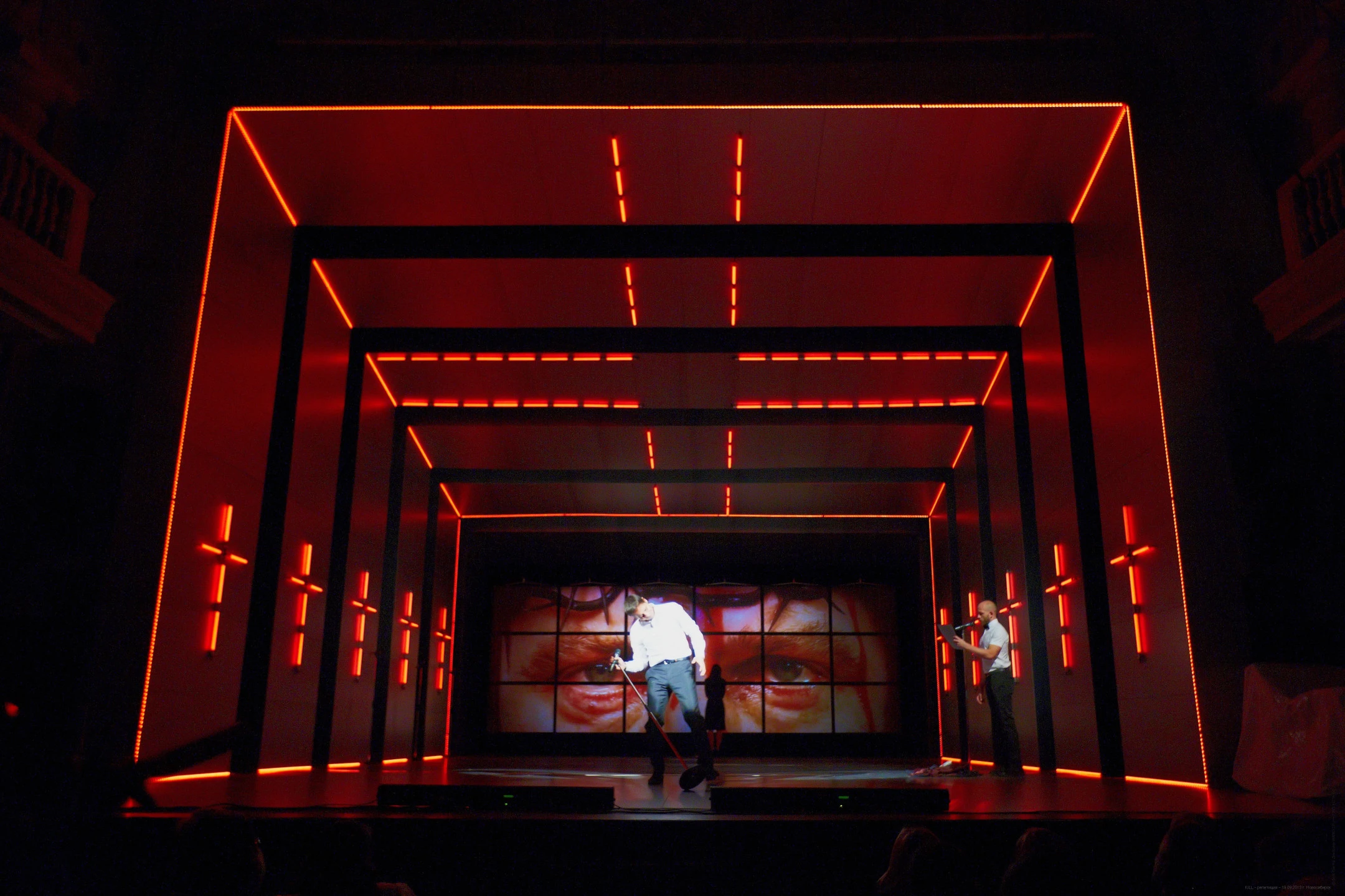 На сцене, лишенной примет какого бы то ни было века, вырастает холодный стальной кабинет. Мотивы жертвенности, хрупкости и разрушения воплощаются здесь самыми непредсказуемыми средствами и с кинематографической подробностью. Яркие визуальные метафоры соседствуют с предельным реализмом действия. Текст Шиллера, сохранив свою структуру и слог, лишился огромных массивов слов, а история стала проще, жестче и понятнее для современного молодого зрителя. Это больше не старинная «мещанская драма» с романтическими идеалами. Это трагедия в современном понимании слова – о мире, где идеалам Шиллера выжить очень сложно.